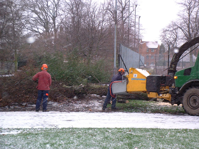 In the midst of an ice-cold blizzard, the tree is stripped of its branches which are shredded ready for use as wood chippings |