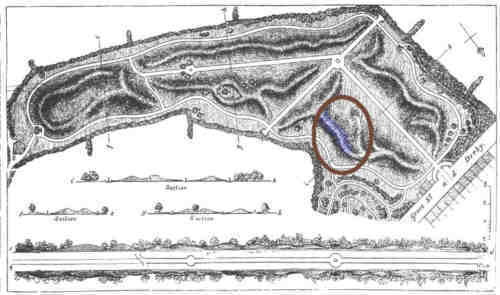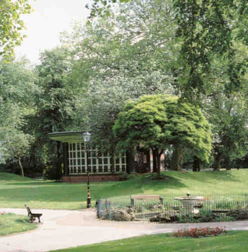 Here I have superimposed a photo of Buxton's new Victorian style Bandstand onto a photo of the Nature garden to give an impression of how a similar bandstand would look at this location. This bandstand could easily be re-produced here in the Arboretum and would be far more efficient, attractive and practical than any troublesome mobile unit. The Buxton Bandstand was constructed in 1997 and opened on September 7th 1997 in memory of Don Redfern, conductor, player and promoter of brass bands. |