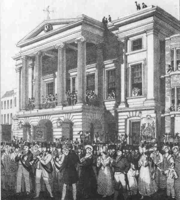 crimson fringe. Portrait of James Watt, decorated with evergreens. Portrait of Dr. Birkbeck, decorated with evergreens. MEMBERS Crimson Banner, V. R., decorated with the National Emblems