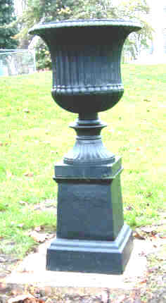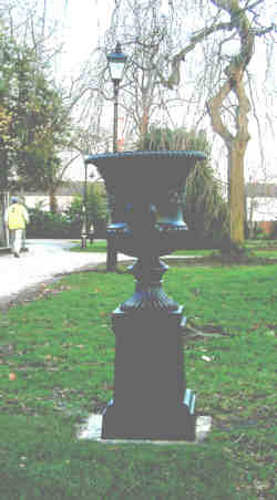 New vases were introduced starting around 1846, some of these are known to have been cast by Andrew Handyside's foundry. Left: one of two remaining original Victorian cast iron vase, designed by R. Blore of Derby, and manufactured at Andrew Handyside's Derby (Britannia) foundry circa 1846, this photo (left) shows the vase before its restoration. Two identical vases were made by Handyside's Britannia Foundry, for the Arboretum circa 1846. The vase shown on the left is the only remaining at its original location in the Arboretum. The second was recently bought from a private owner by the Derby Museum Service. |