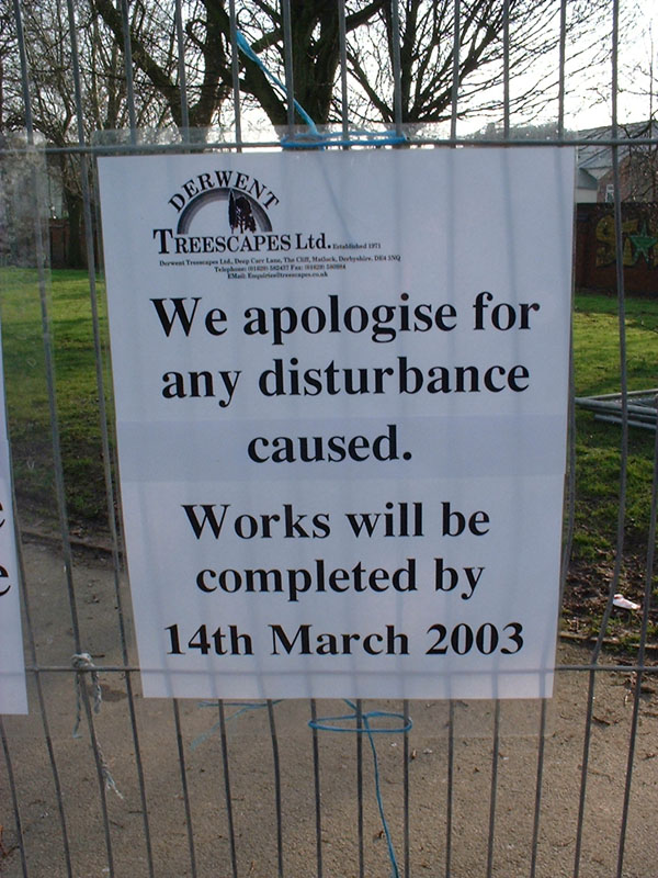 Following much controversy over felling healthy trees the project finally got underway on the morning of February 4th 2003 and the peaceful sound of birdsong was to be replaced with the whining chatter of the chain-saw for the next couple of months: |
