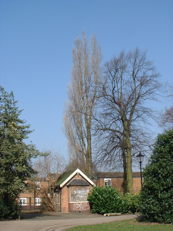 Photo taken on March 17th 2003 shows the brick cabin used by Park Keepers at the Grove Street Lodge as a retreat. According Percy Thrower, he was paid 7 shillings and sixpence to stay spend nights here whilst on fire/bomb watch during the 1941-1942 air raids that hit the Arboretum. The Lombardy Popular was one of many that enclosed the Arboretum since 1840. This one was removed and despite promises to replace it, it has never been replaced. |